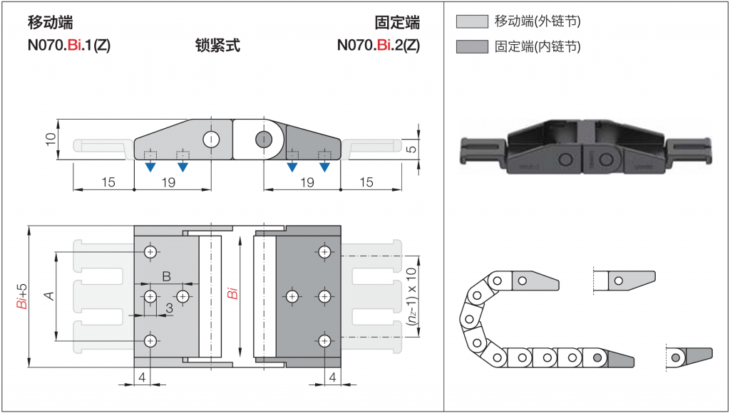 | Bi[mm] | ZB接头代码/带扎线板 | ZB接头代码/不带扎线板 | A[mm] | B[mm] | 齿数nz |